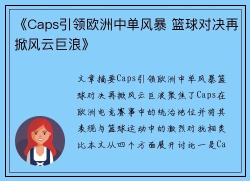 《Caps引领欧洲中单风暴 篮球对决再掀风云巨浪》聚焦了Caps在欧洲电竞赛事中的统治地位,并将其表现与篮球运动中的激烈对抗相类比。本文从四个方面展开讨论:一是Caps在欧洲赛场的崛起与成就;二是电竞与篮球中单对决的相似性;三是Caps背后的训练和策略支撑;四是Caps未来发展潜力的展望。每一部分都结合了数据分析和真实案例,展现了电竞与体育的共通之处,引发了对未来电竞运动前景的深刻思考。